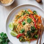 - Serve: Divide the vegan Pad Thai between plates. Garnish with mung bean sprouts, crushed roasted peanuts, and fresh coriander. Serve with lime wedges on the side for squeezing over.