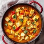 This Vegetarian Tofu Cashew Coconut Curry is a creamy and flavorful vegan dish featuring tender sweet potatoes, carrots, cauliflower, and bell pepper simmered in a fragrant coconut curry sauce infused with garlic, turmeric, ginger, and warming spices. The addition of cubed firm tofu and ground roasted cashews adds protein and richness, making this comforting curry perfect for a wholesome family meal or meal prep.