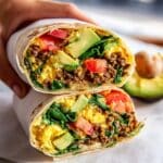These Tofu Scramble Breakfast Burritos are a delicious and satisfying vegan brunch option, featuring a flavorful tofu scramble combined with soyrizo, sautéed vegetables, and creamy avocado, all wrapped in warm flour tortillas with a hint of chipotle mayo.
