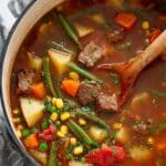 Can I make this soup in an Instant Pot?Yes! Use the sauté function to brown the beef and vegetables, then pressure cook on high for about 35 minutes. Remember to add the potatoes and green beans after pressure cooking and simmer a few minutes to soften.