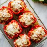 These Vegetarian Stuffed Peppers feature roasted red bell peppers filled with a savory mixture of brown rice, pinto beans, fresh tomatoes, and aromatic spices, all topped with melted cheese. Inspired by Mexican flavors, this wholesome recipe offers a balanced, flavorful meal perfect for vegetarians, with options for garnishing to enhance the taste and presentation.