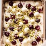 - Assemble: Pour the chocolate mixture into the prepared pan and spread it out evenly. Then place the reserved glacé cherries on top and sprinkle with the chopped pistachios. Bang and shake the pan assertively to help everything settle evenly.